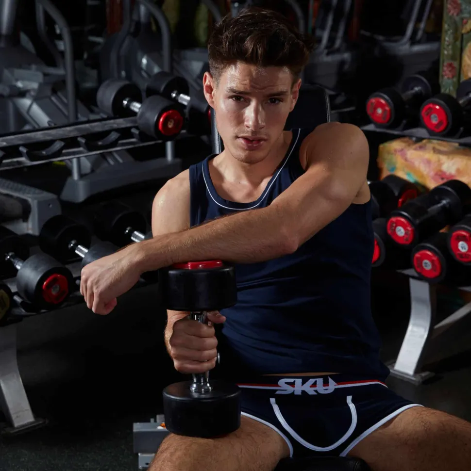 Débardeur sport et sexy en coton premium doux et extensible de couleur intense. Cintré juste comme il faut, il valorisera votre musculature sans gêner vos mouvements. Coupe courte et arrondie en bas, pour tomber parfaitement sur un pantalon. Le col rond est subtilement souligné par un liseré de couleur contrastée. Logo SKU sur la poitrine.