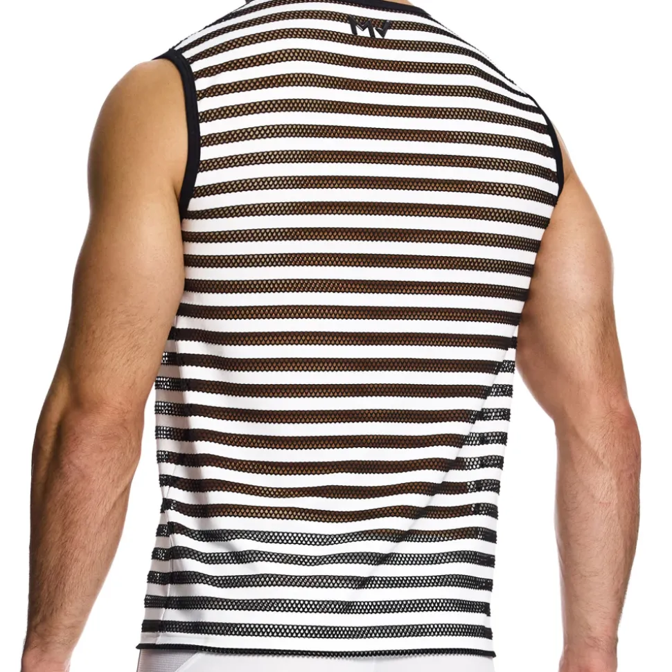 Débardeur sexy constitué d’un jeu de matière entre résille extensible transparente et rayures blanches en microfibre opaque. Coupe ajustée. Col rond. Logo MV en silicone dans le dos.