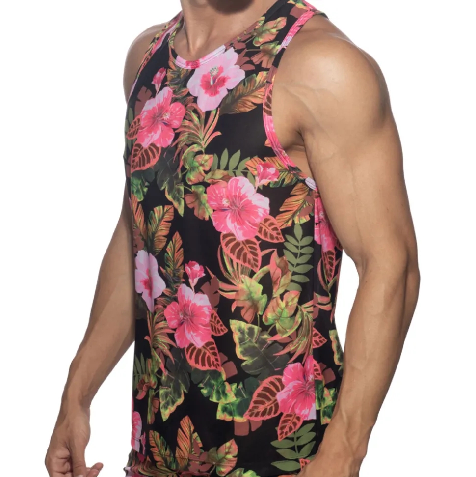 Débardeur en microfibre semi-transparente, douce et légère. Superbe imprimé tropical constitué de fleurs roses sur fond noir. Coupe ajustée, col rond. Etiquette AD en silicone à l’arrière.