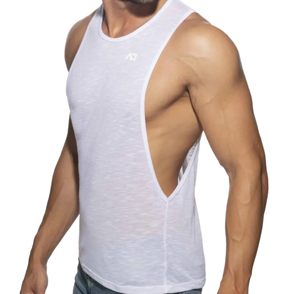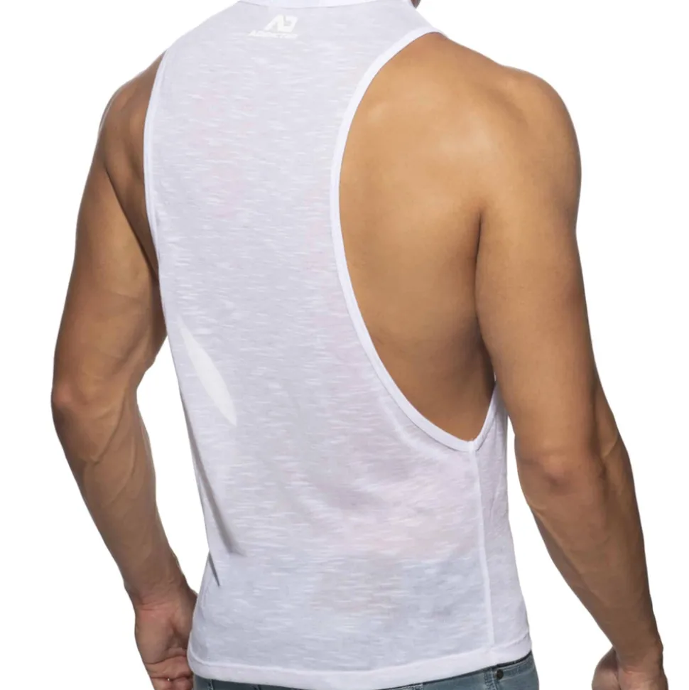 Débardeur en microfibre flammée très fine, légère, et semi-transparente. Large ouvertures sous les bras. Imprimé Addicted ton sur ton sur la poitrine et dans le dos.