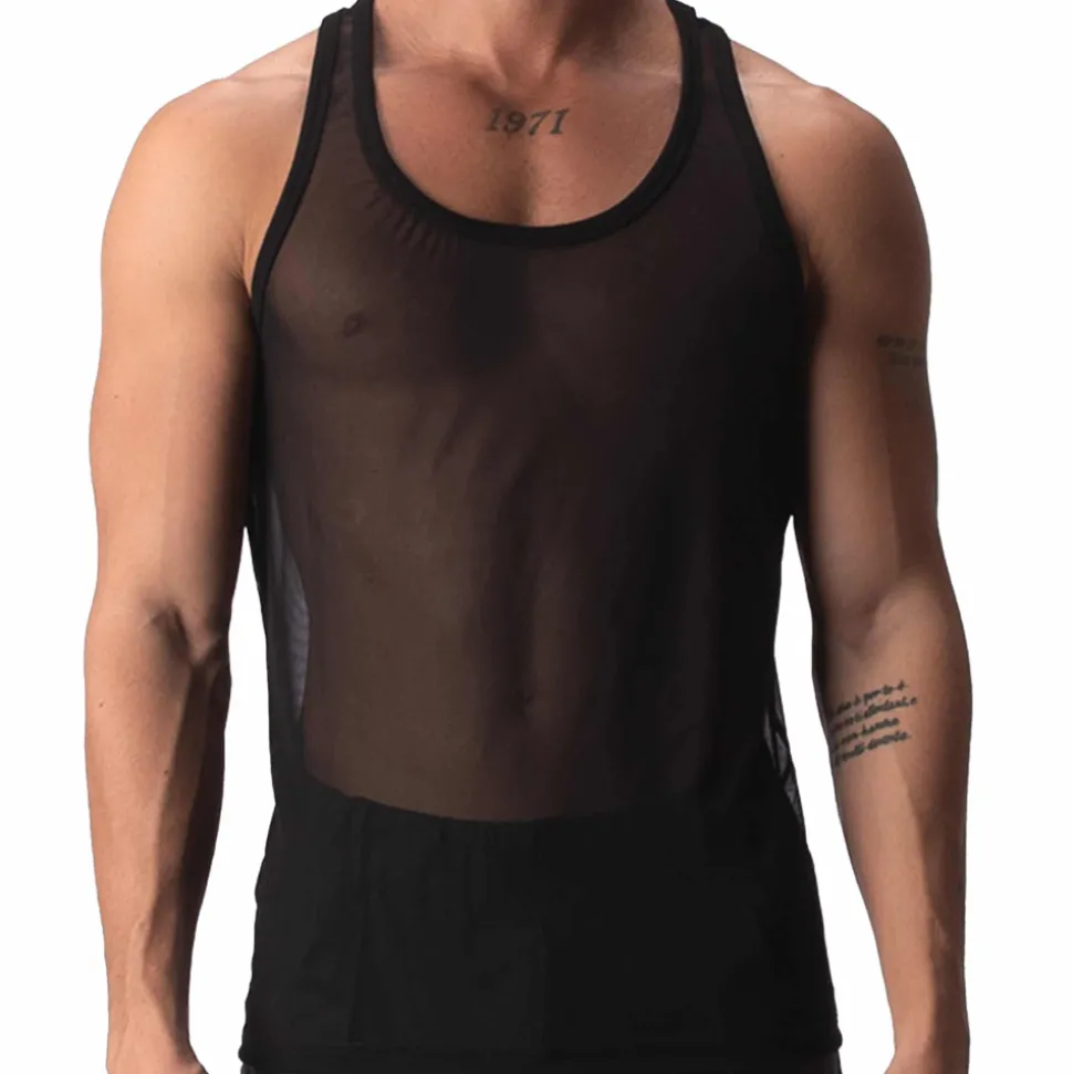 Débardeur sexy en résille transparente, fine et extensible. Encolure et emmanchures côtelées. Dos nageur. Etiquette Barcode en silicone en haut du dos.