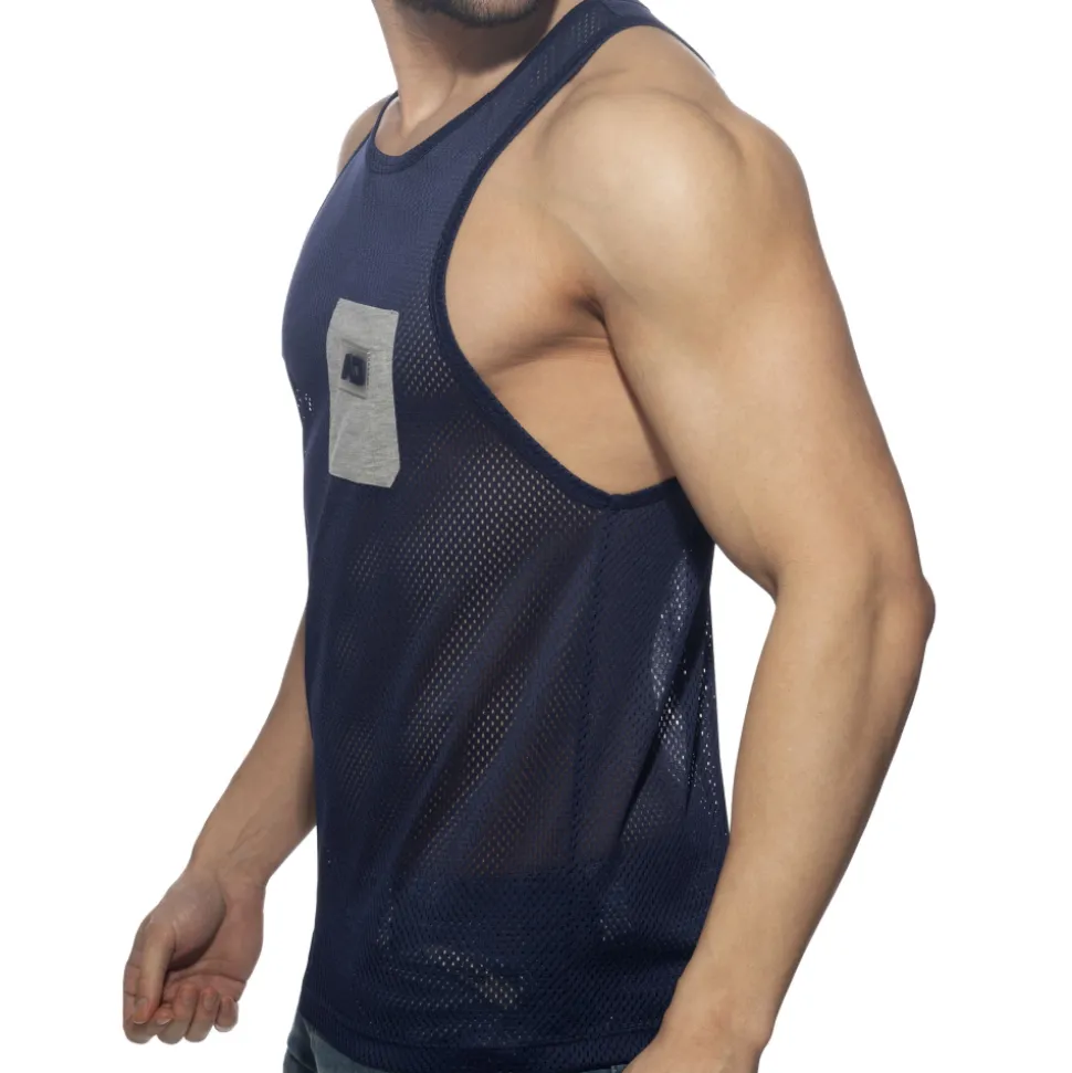 Débardeur en mesh doux et respirant. Poche factice de couleur contrastée sur la poitrine, avec logo AD en silicone. Coupe ajustée, dos nageur et col rond.