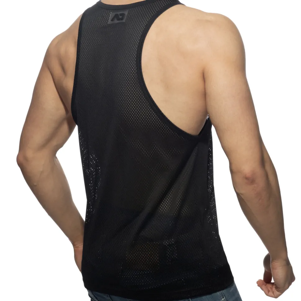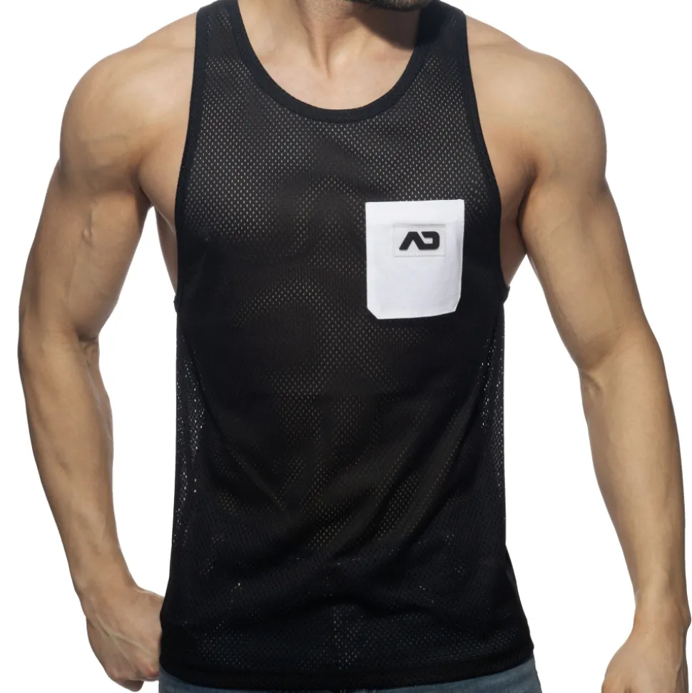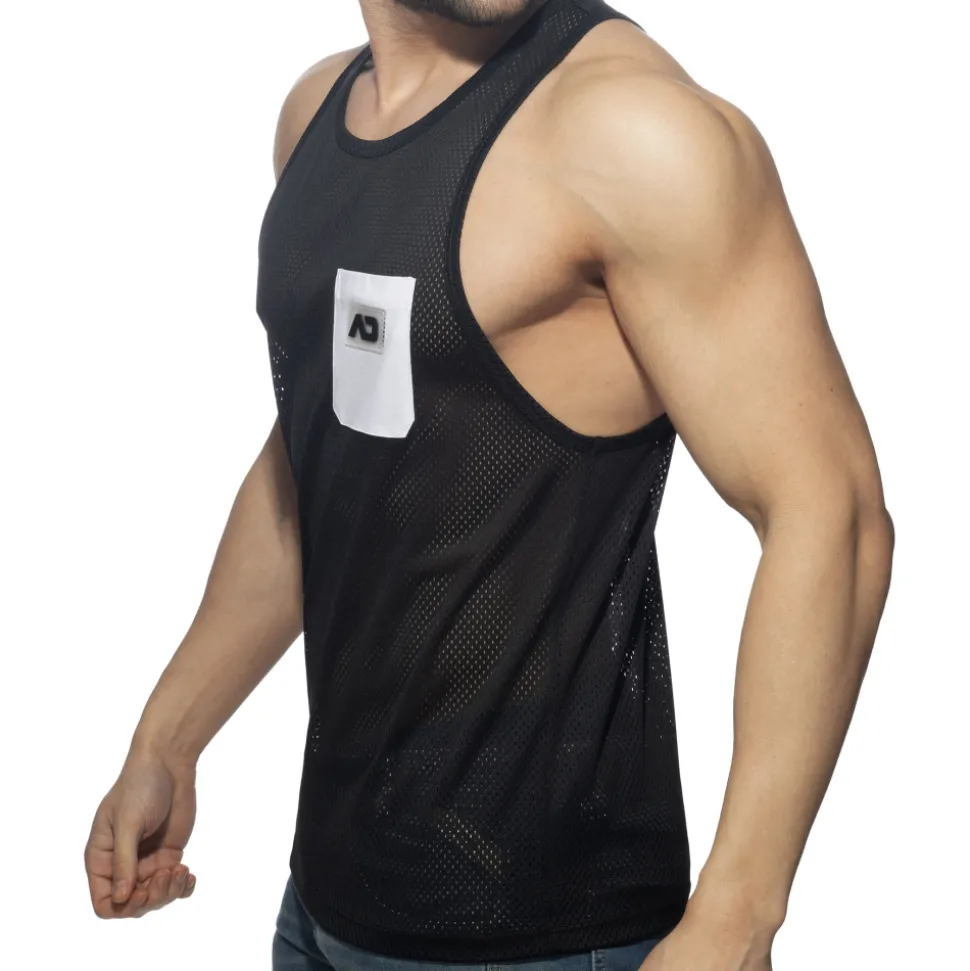 Débardeur en mesh doux et respirant. Poche factice de couleur contrastée sur la poitrine, avec logo AD en silicone. Coupe ajustée, dos nageur et col rond.
