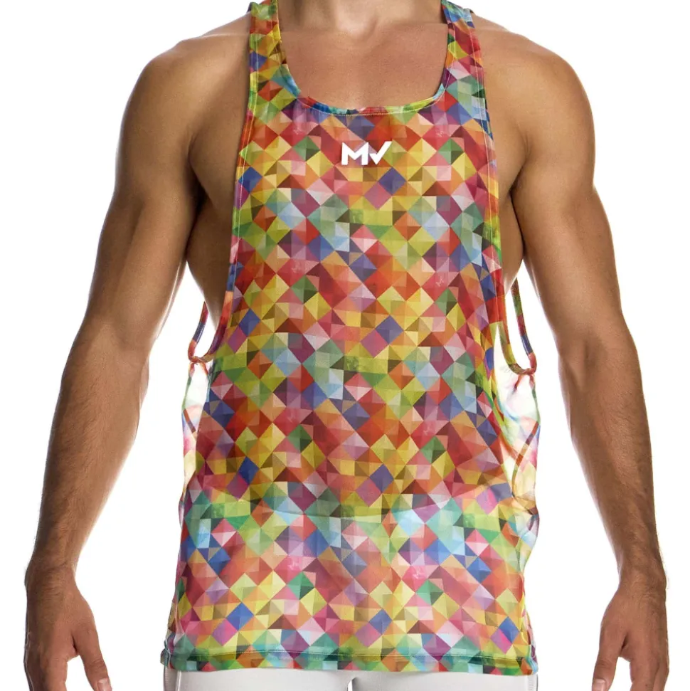 Débardeur semi-transparent en mousseline ultra légère, fluide et confortable. Imprimé géométrique aux couleurs de l’arc-en-ciel. Larges ouvertures sous les bras. Coupe ample. Logo MV en silicone sur la poitrine.