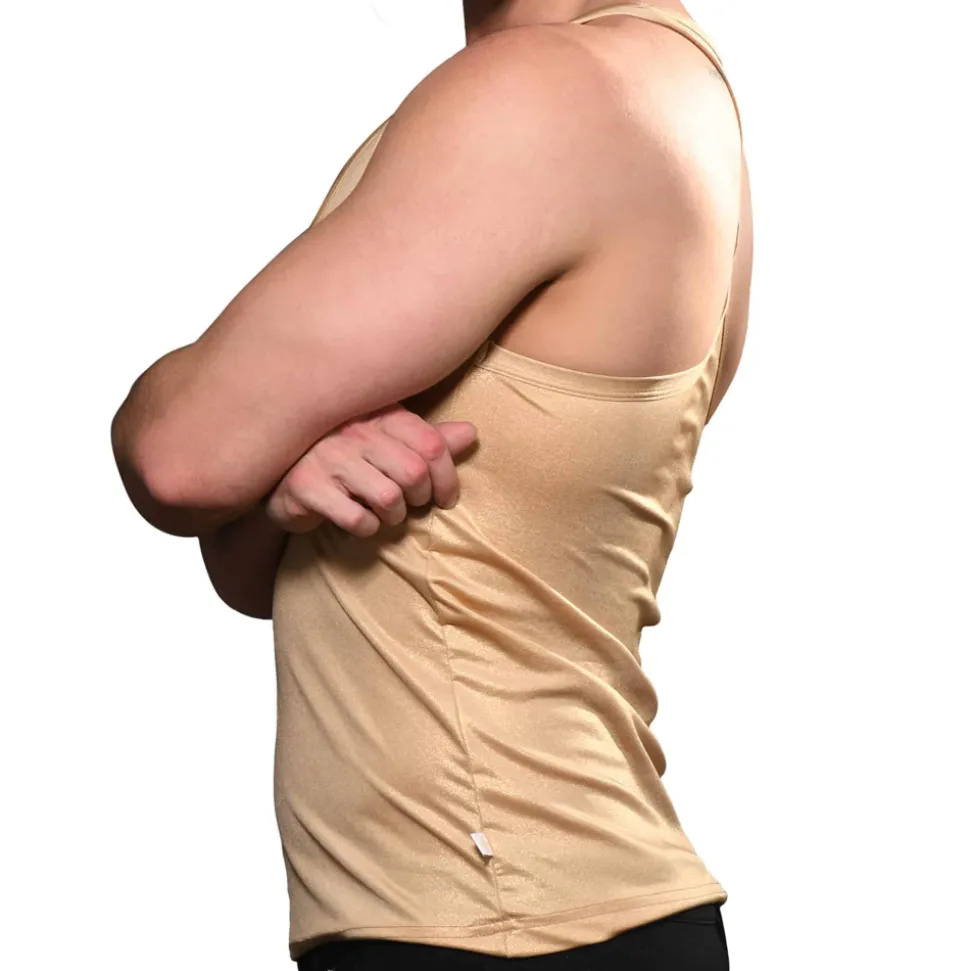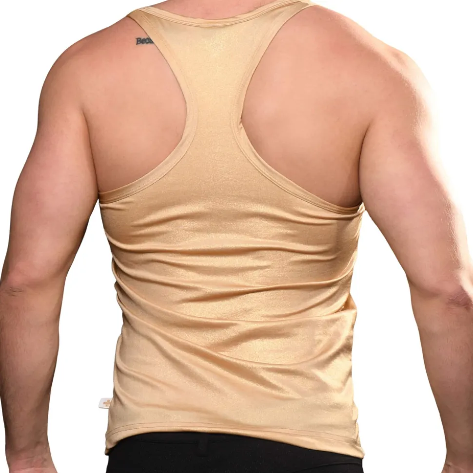 Débardeur en microfibre scintillante de couleur dorée. Coupe ajustée pour valoriser votre torse. Col carré. Dos nageur.