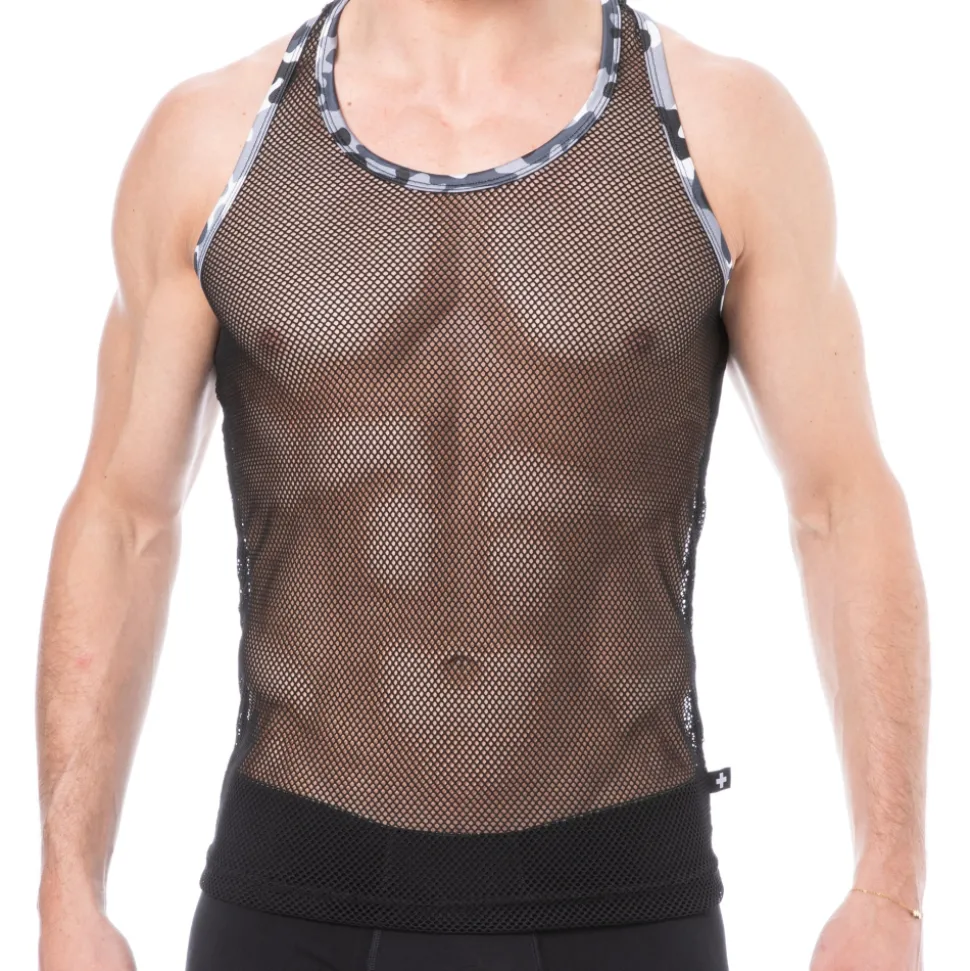 Débardeur en maille ajourée et transparente. Tissu très doux, extensible dans 4 directions. Détails de couleur camouflage. Edition limitée