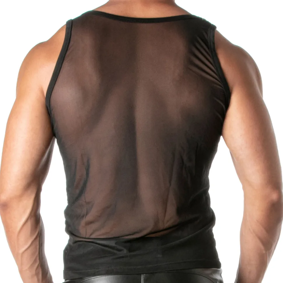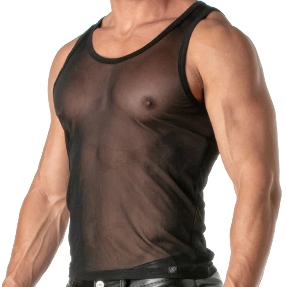 Débardeur provocant en résille extensible et transparente. Coupe ajustée. Etiquette TOF Paris. Fabrication française.