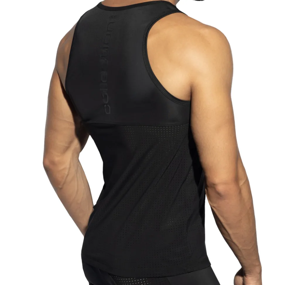 Débardeur technique en matière incroyablement douce et légère, combinant empiècements unis et inserts respirants en micro-mesh, pour une partique sportive intensive. Coupe ajustée et col rond. Logo ES Collection en 3D ton-sur-ton en haut du dos.