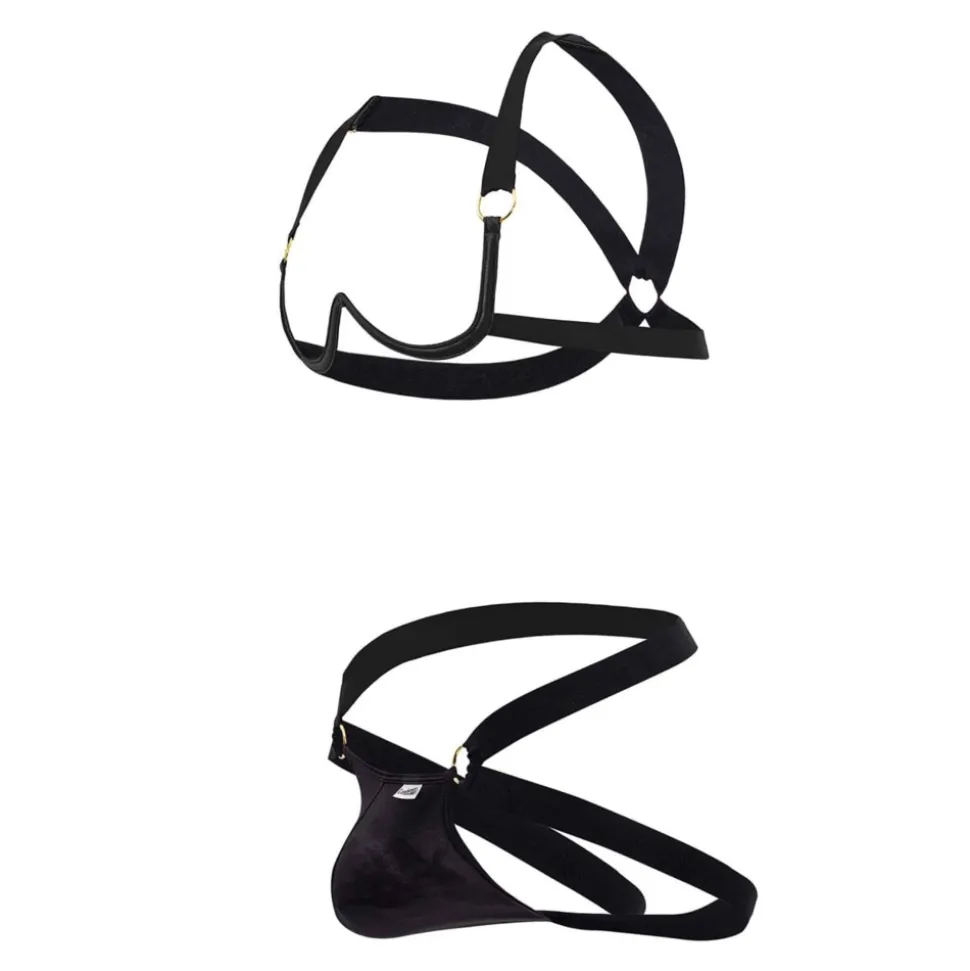 Ensemble sexy et provocant composé d’un harnais soutien-gorge et d’un jockstrap en microfibre extensible. Le harnais soutient la poitrine à l’aide d’une armature rigide. Bandes élastiques reliées par des anneaux métalliques. Bretelles réglables. Poche frontale non doublée.