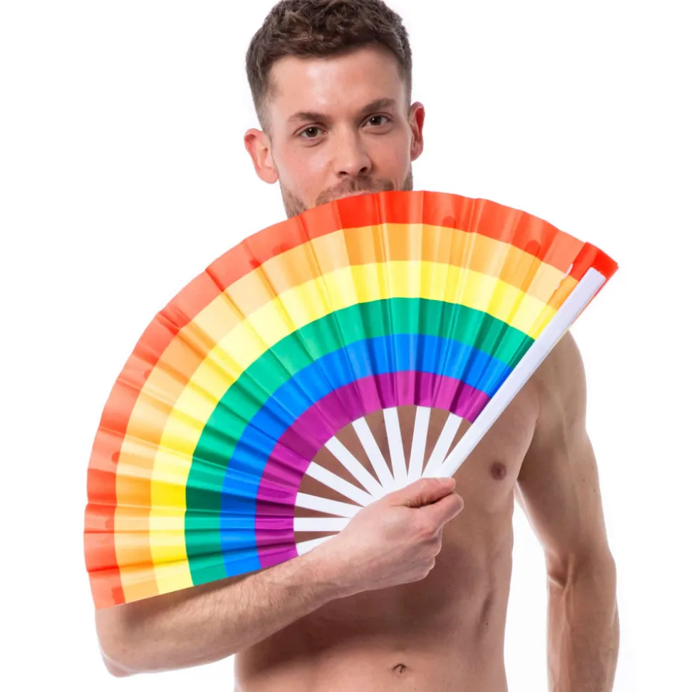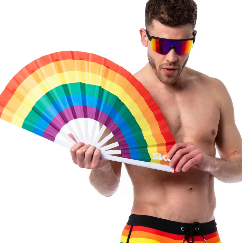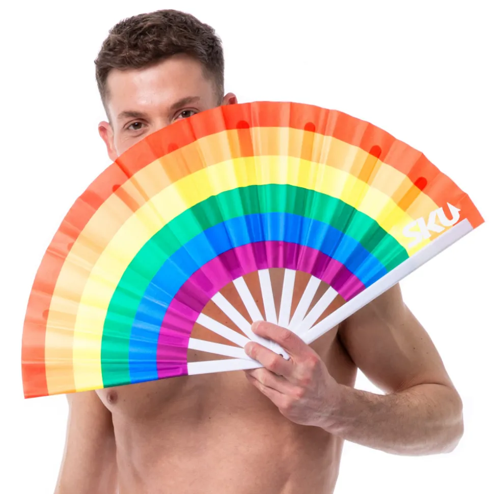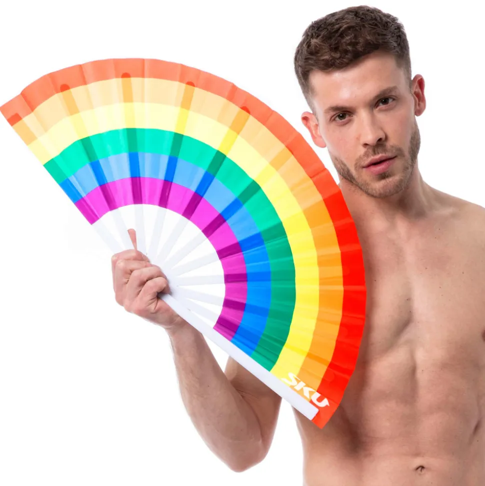 Eventail de grande taille imprimé aux couleurs de l’arc-en ciel. Logo SKU. Dimensions (ouvert) : 64 x 33 cm.