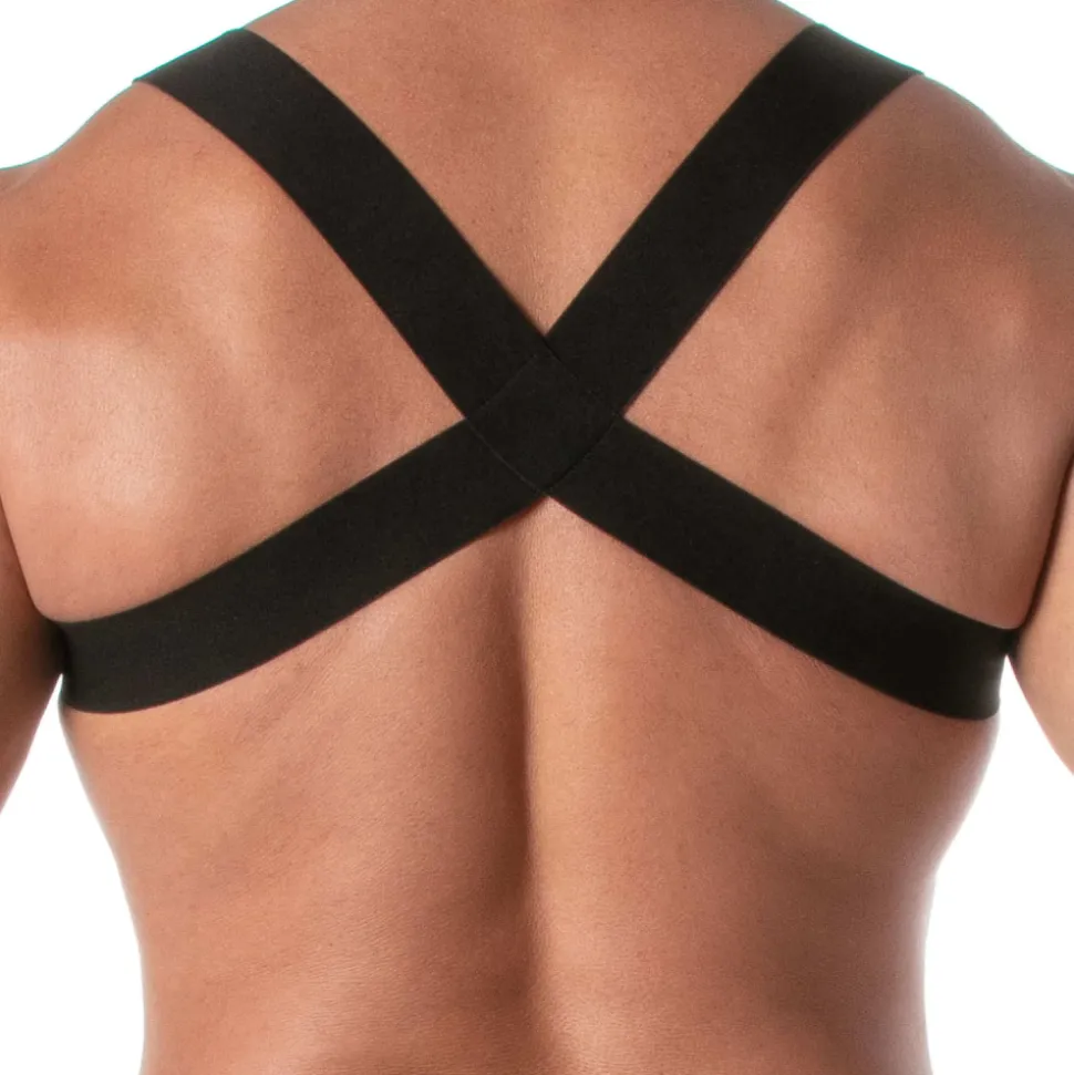 Harnais sexy et provocant en microfibre métallisée brillante, qui reflète la lumière comme une boule à facette. Larges bandes élastiques croisées dans le dos. Poche à fermeture Eclair sur la poitrine. Etiquette signée TOF Paris.