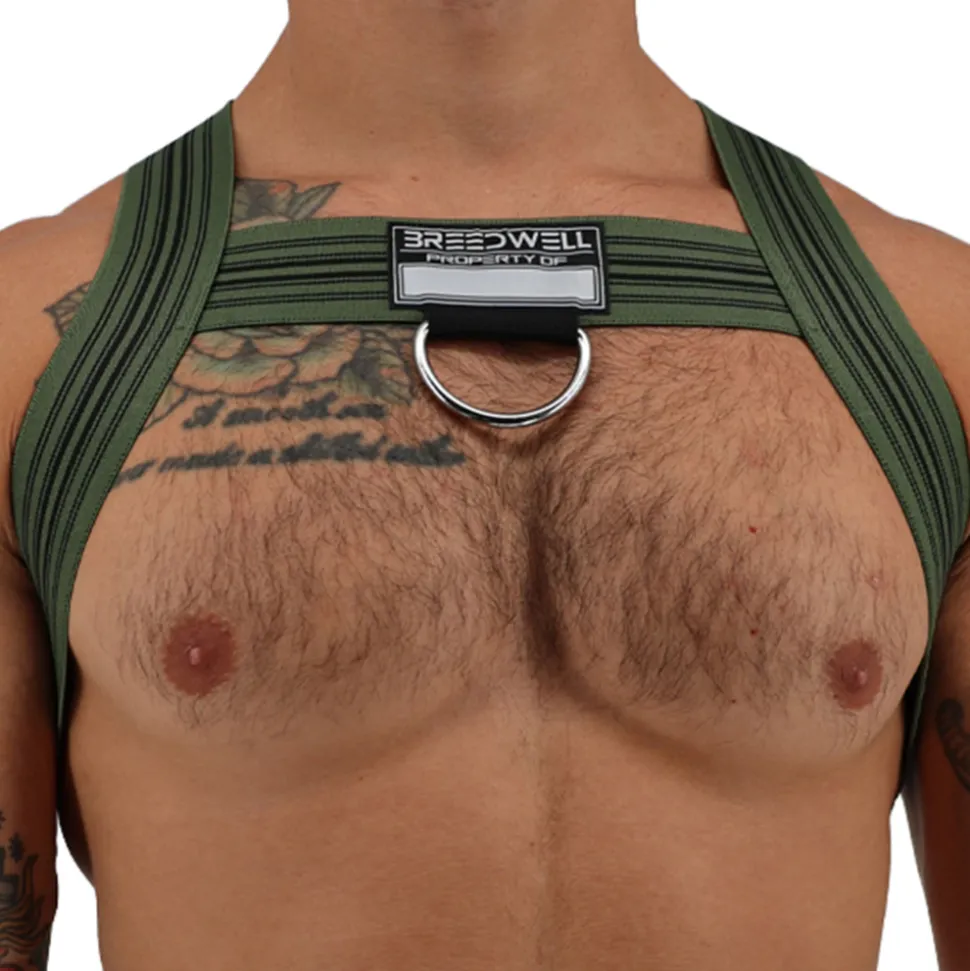 Harnais sexy constitué de bandes élastiques larges formant un X dans le dos. Devant, la forme en H met en valeur vos pectoraux. Patch Breedwell à l’avant avec anneau métallique.