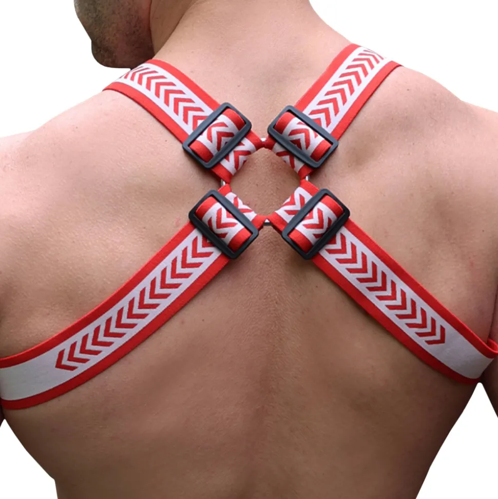Harnais ultra sexy constitué de bandes élastiques bicolores signées Breedwell. Bretelles réglables reliées par des anneaux en acier inoxydable. Sangle horizontale amovible sur la poitrine avec patch Breedwell en PVC.