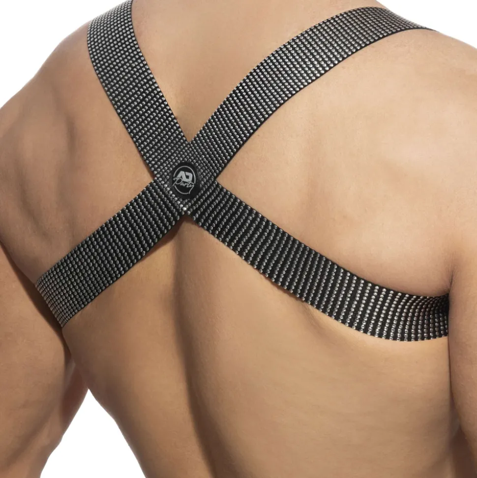 Harnais original et confortable, dont les larges bandes élastiques se croisent en formant un X dans le dos. Les straps sont recouverts de picots argentés apportants des reflets métalliques scintillants. Logo AD Party en silicone à l’arrière. Taille XS/S pour un tour de poitrine de 84 à 94 cm. M/L : 94 à 104 cm. XL/XXL : 104 à 114 cm.