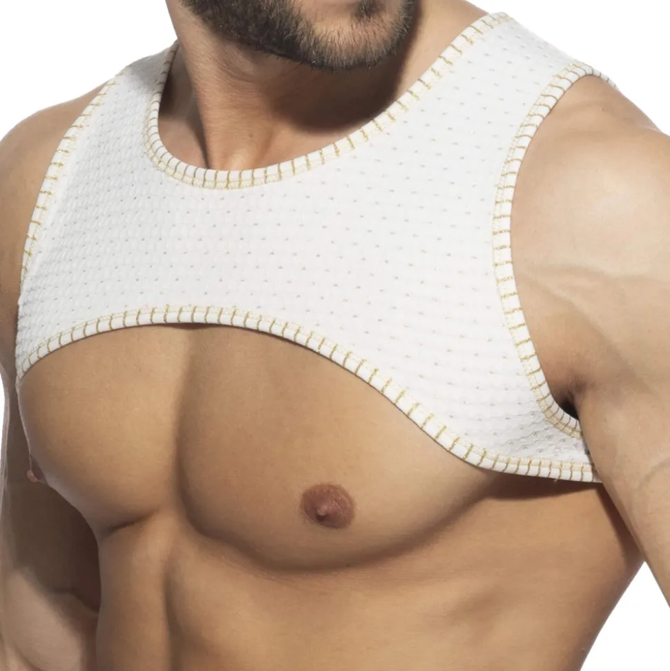 Harnais réversible en microfibre alliant élégance et confort. Grâce à la technologie U-Turn, il présente deux motifs distincts : fines rayures dorées d’un côté et pois dorés de l’autre. Logo AD en silicone à l’arrière.