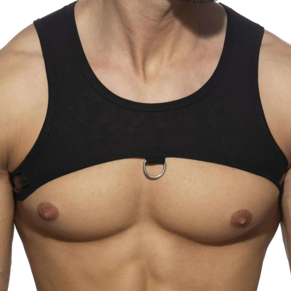 Harnais sexy en mélange de viscose et de microfibre de couleur unie. Empiècements en simili cuir sur les côtés. Boucle metallique devant. Etiquette AD Fetish en silicone à l’arrière.