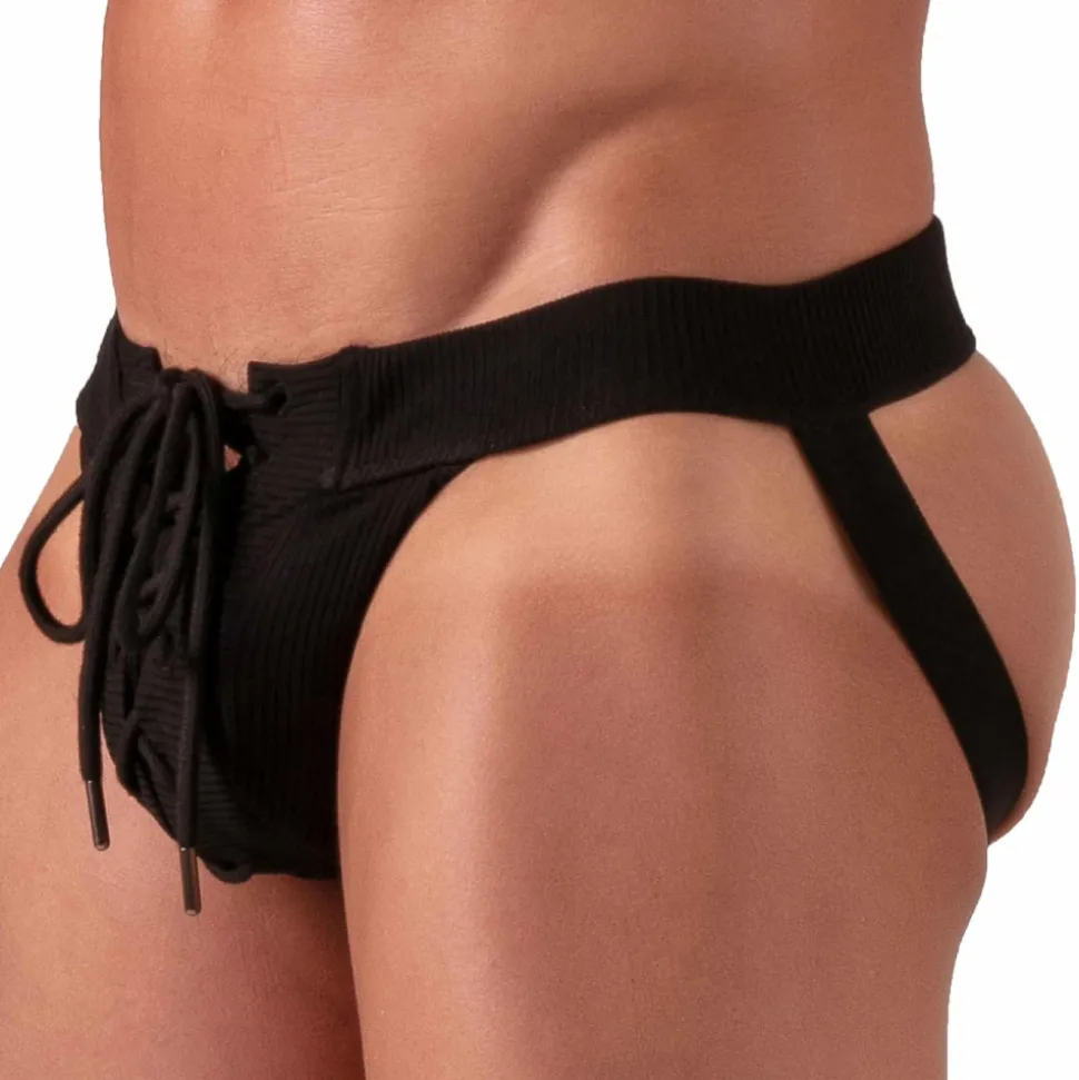 Jockstrap sexy en coton côtelé très doux et confortable. Laçage façon corset pour ouvrir la poche frontale. Ceinture élastique recouverte. Petite poche secrète. Fabrication française.