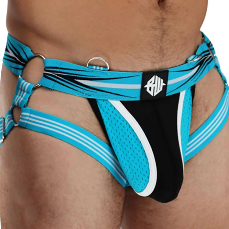 Jockstrap en microfibre ultra douce, fine et légère. Empiècement en mesh respirant de chaque côté de la poche frontale non doublée. Design original et provocant avec ses bandes élastiques ajustables autour des cuisses, reliées à la ceinture par des anneaux métalliques. Ceinture élastique dotée d’anneaux métalliques pour attacher le harnais Circuit Breaker (vendu séparément). Patchs Breedwell en PVC de qualité supérieure.