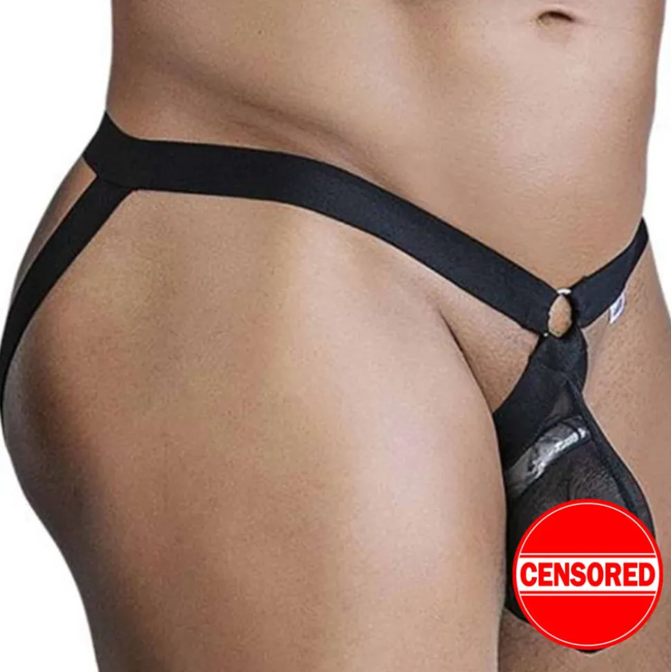 Jockstrap original et minimaliste en fine résille transparente. La poche frontale non doublée et reliée à la ceinture élastique par un anneau métallique. Les bandes élastiques offrent un design en Y très échancré sur les fesses.