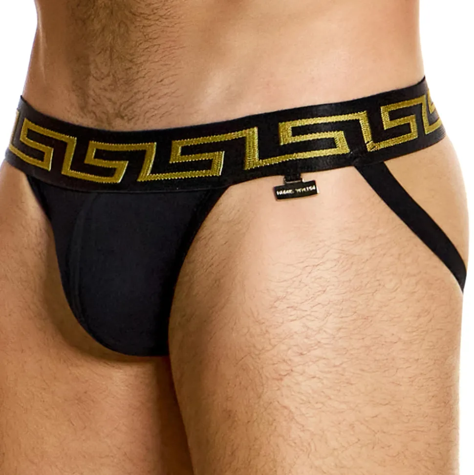 Jockstrap taille basse en coton doux. Poche frontale doublée pour plus de confort. Plaque métallique Modus Vivendi sur la hanche gauche. Motif inspiré par la Grèce antique sur la ceinture élastique.