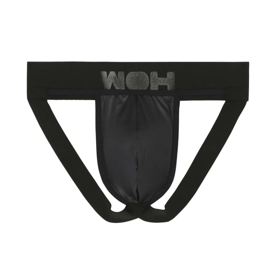 Jockstrap sexy et provocant en microfibre extensible imitant le cuir, pour un look fétichiste. Poche frontale préformée, non doublée. Ceinture élastique extra-large signée WOH en lettres de silicone.