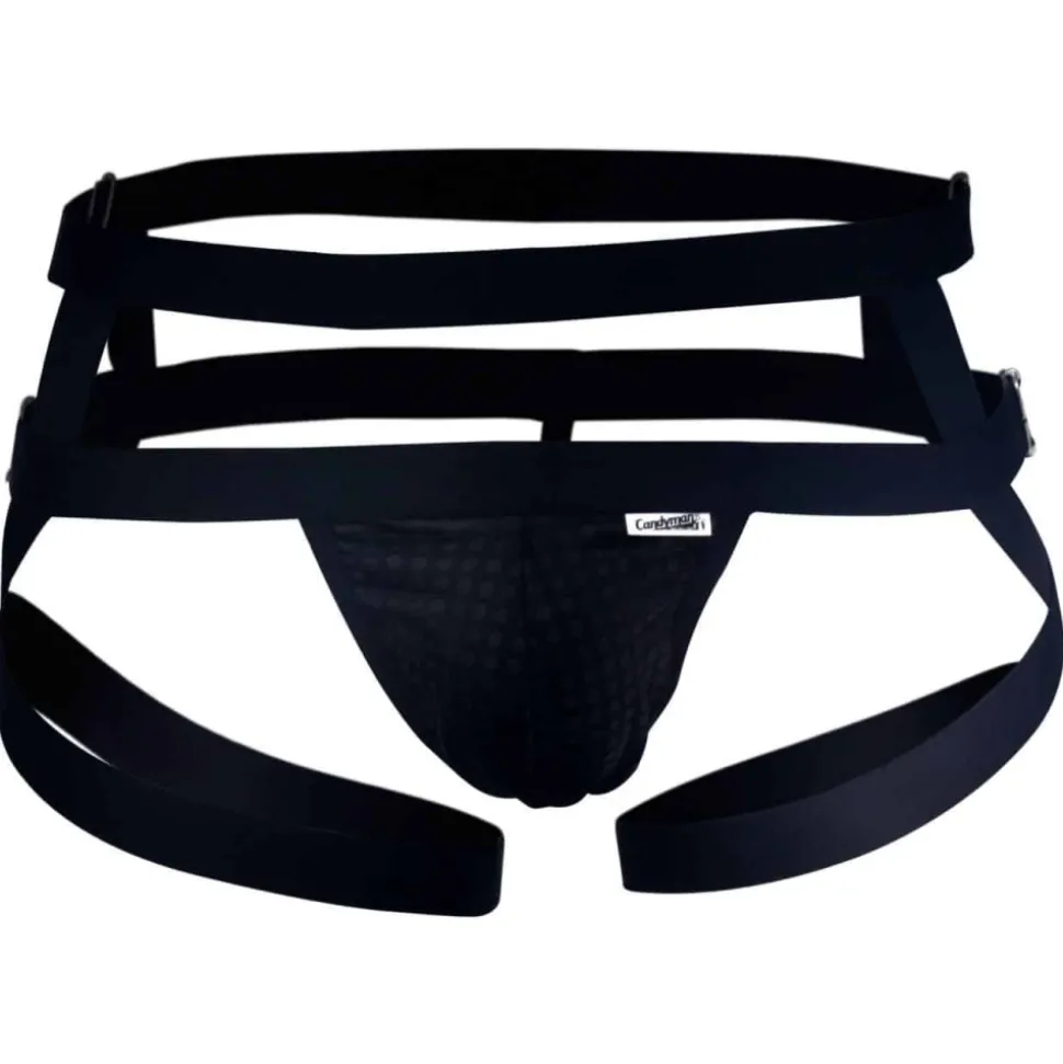Jockstrap en microfibre stretch avec bandes élastiques ajustables. Straps supplémentaires pour soulever les fesses et leur donner un bel aspect bien rond. Poche frontale à pois ton sur ton.