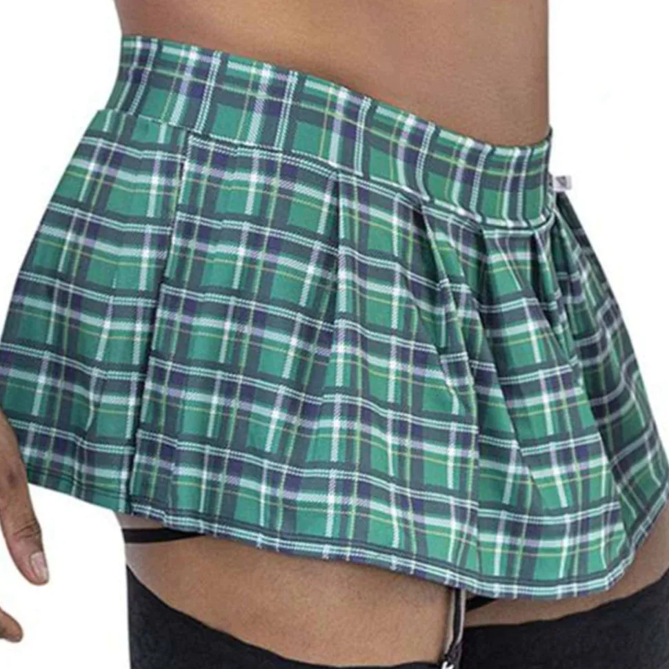 Mini jupe plissée en microfibre douce et extensible imprimée d’un motif tartan. Livrée avec un porte-jarretelle constitué de fines bandes élastiques reliées par des boucles métalliques en forme de cœur. Des pinces permettent d’attacher des bas (vendus séparément).