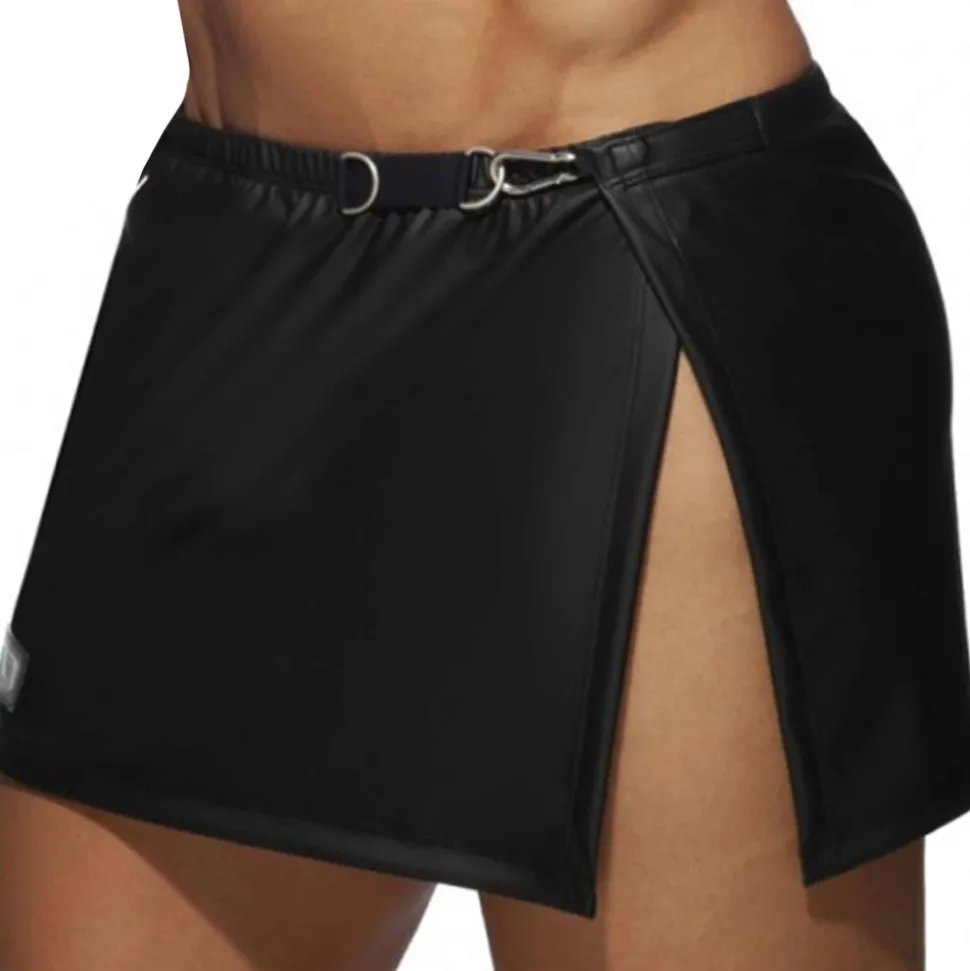 Jupe courte fendue en microfibre mate imitant le cuir. Ceinture élastique et mousqueton métallique pour un ajustement parfait. Logo AD en silicone.