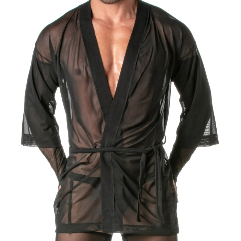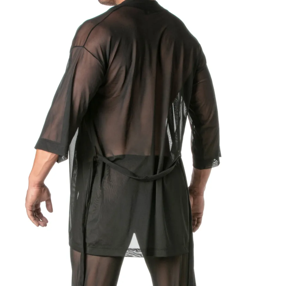 Kimono provocant en résille extensible et transparente. Manches 3/4. Passants et ceinture à la taille. Fabrication française.