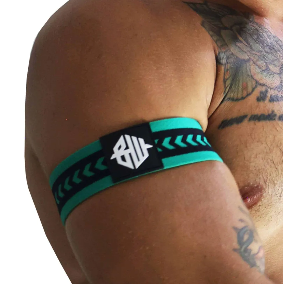 Paire de brassards en bande élastique jacquard souple. Chevrons de couleur contrastée. Accessoire sexy, parfait pour flatter vos biceps. Logo Breedwell en PVC.