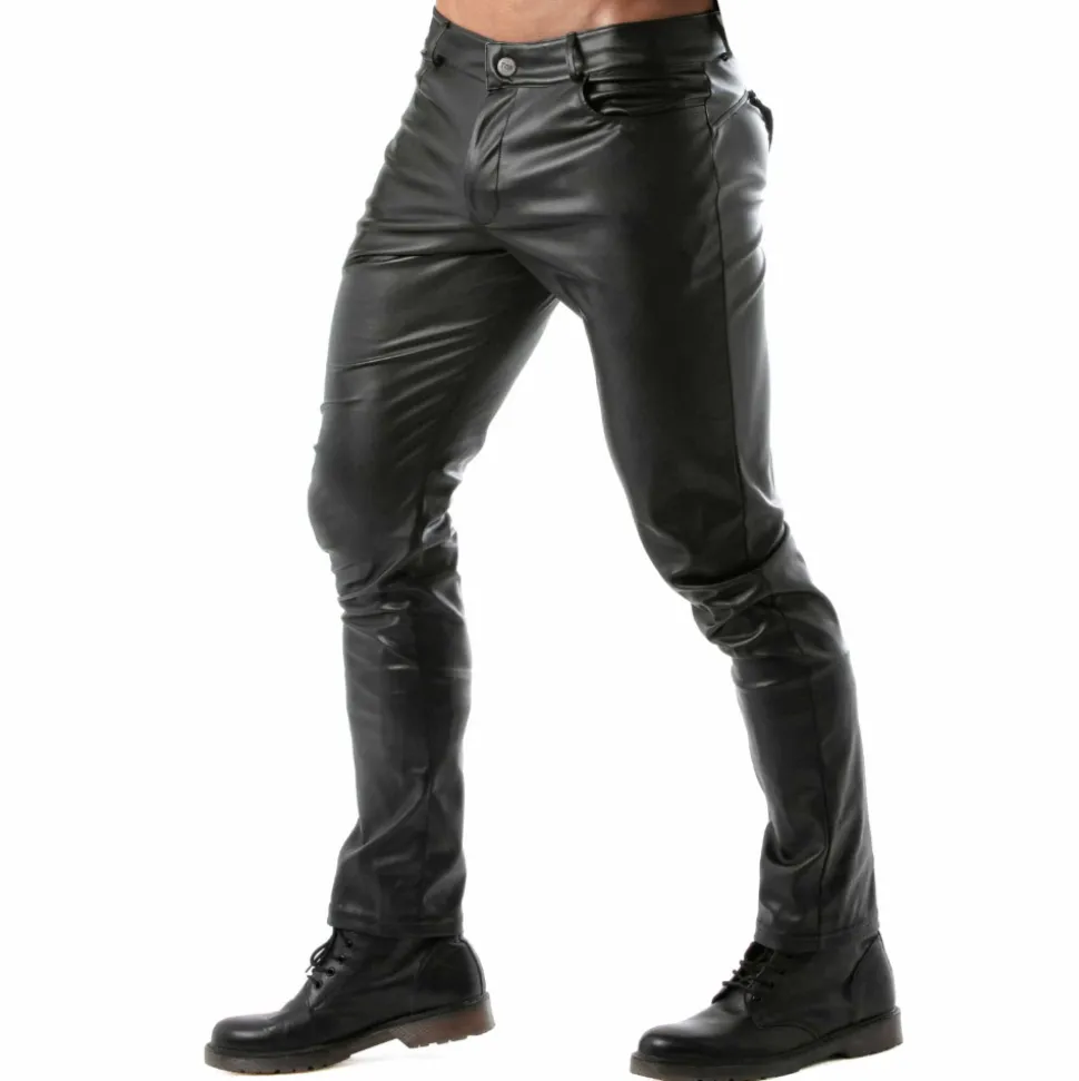 Pantalon sexy en simili-cuir extensible pour un look fetish. Empiècement détachable sur les fesses grpace à une fermeture Eclair et des boutons-pression. 3 poches. Braguette à boutons et fermeture Eclair. Passants de ceinture. Fabrication française.
