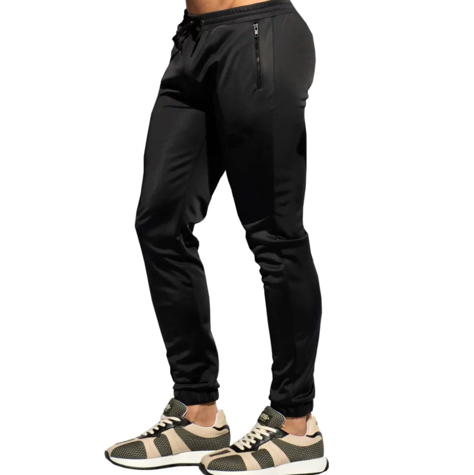 Pantalon de sport en microfibre douce et respirante de couleur unie. 2 poches à fermeture Eclair sur les côtés. Logo ES Collection en silicone sur la cuisse gauche. Bandes élastiquées aux chevilles. Ceinture élastique avec cordon de serrage.