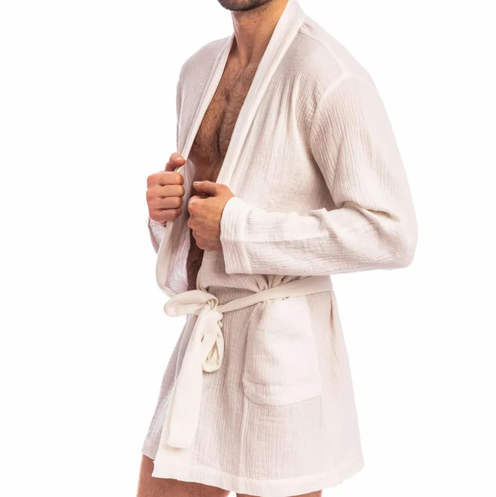 Robe de chambre courte en crêpe léger 100% coton. 2 poches plaquées sur les côtés. Ceinture. Logo L’homme Invisible en haut du dos.