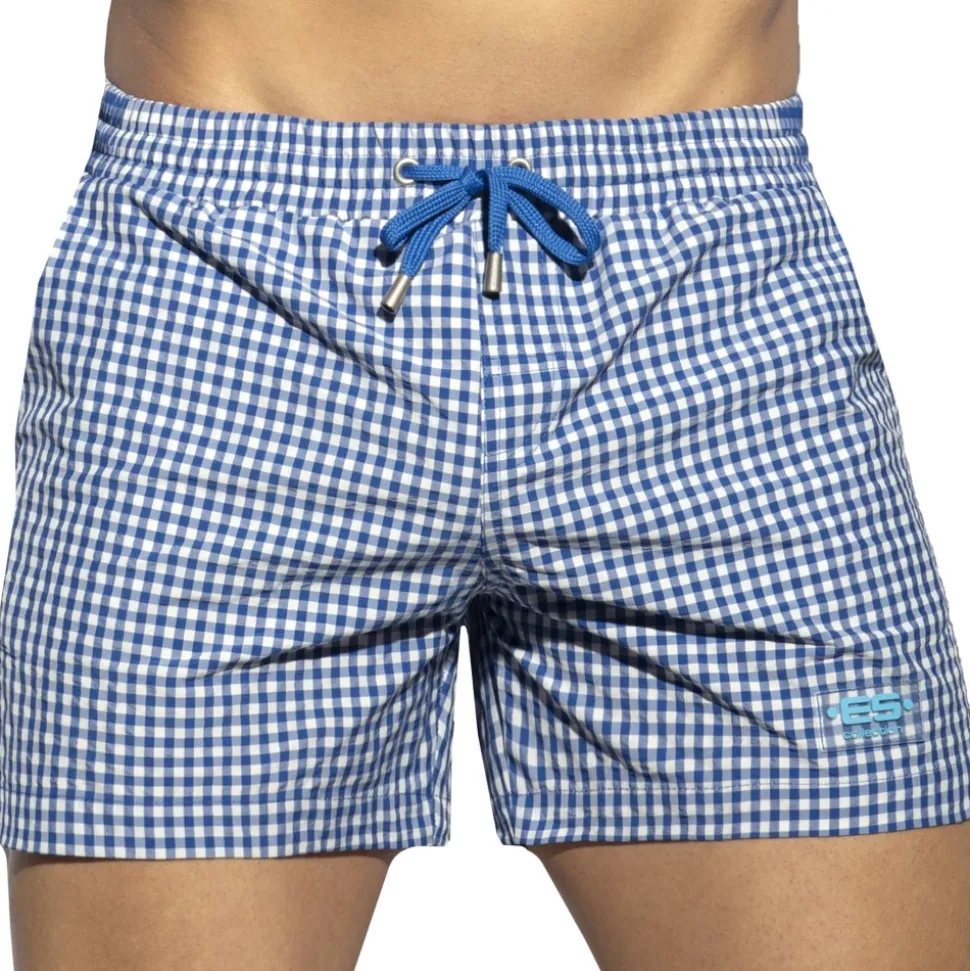 Short de bain taille basse en microfibre légère et confortable, séchant rapidement. Motif vichy à carreaux très tendance. Slip intérieur U-Shape en mesh pour un grand confort. 3 poches. Logo ES Collection en silicone sur la cuisse gauche. Ceinture élastique avec cordon de serrage.