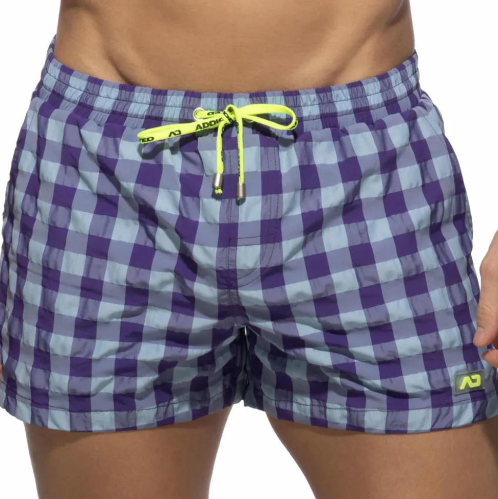 Short de bain taille basse en microfibre légère et confortable, séchant rapidement. Motif à carreaux de couleur intense. Slip intérieur U-Shape en mesh pour un grand confort. Deux poches avants et une poche arrière avec oeillet. Logo AD en silicone sur la cuisse gauche. Ceinture élastique avec cordon de serrage.