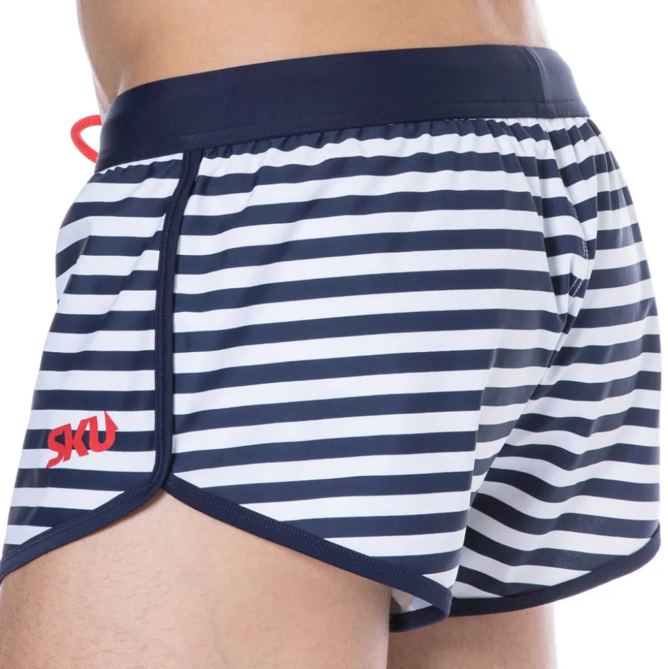 Short de bain en microfibre séchant rapidement. Rayure très élégante façon marinière. Coupe taille basse très ajustée. Slip intérieur en mesh. Logo SKU imprimé sur la cuisse gauche. Ceinture élastique avec cordon de serrage.