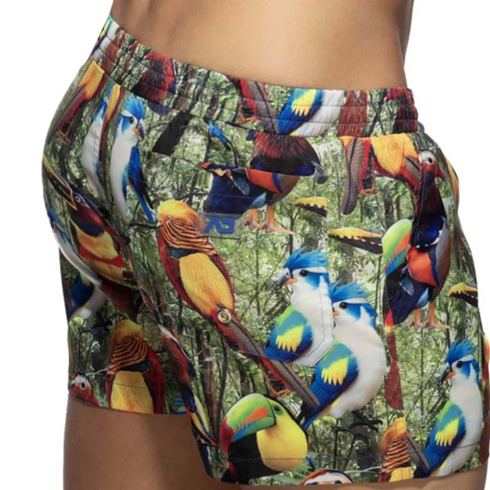 Short de bain taille basse et original en microfibre séchant rapidement. Imprimé vif et coloré constitué d’oiseaux exotiques. Slip intérieur U-Shape en mesh pour un excellent maintien et un confort optimal. 3 poches. Ceinture élastique avec cordon de serrage. Logos AD en silicone assortis sur la cuisse gauche et la poche arrière droite.