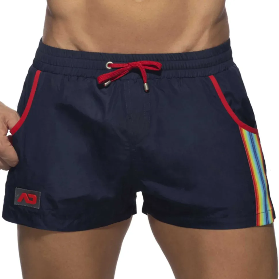 Short de bain taille basse, sexy et ajusté, en microfibre séchant rapidement. Slip intérieur U-Shape en mesh pour un grand confort. Bande aux couleurs de l’arc-en-ciel sur le côté gauche. 2 poches. Détails de couleur contrastée. Ceinture élastique avec cordon de serrage. Logo Addicted en silicone sur la cuisse droite.
