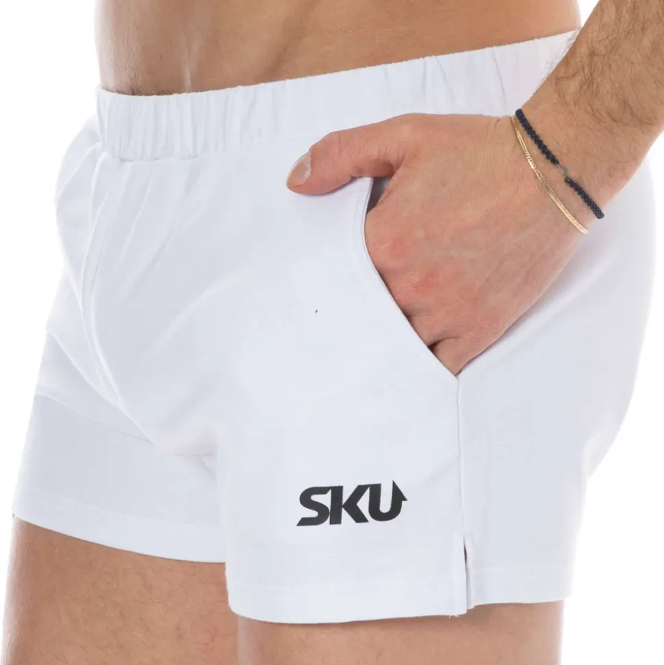 Short de sport très confortable en molleton 100% coton. Coupe courte, ajustée et échancrée sur les côtés. 2 poches latérales et une poche arrière. Logo SKU imprimé sur la cuisse gauche. Ceinture élastique recouverte.