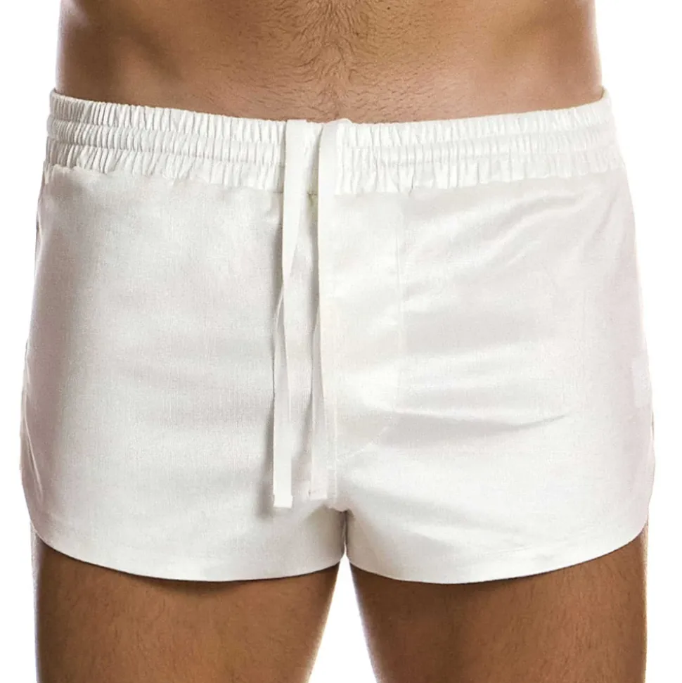 Short sexy en coton tissé doux, léger et respirant. Tissu imitant le velours avec une finition brillante. Coupe rétro très ajustée et échancrée sur les côtés. Ceinture élastique recouverte avec cordon de serrage intérieur. Poche sur la fesse droite. Logo Modus Vivendi en silicone sur la cuisse gauche. Braguette factice.