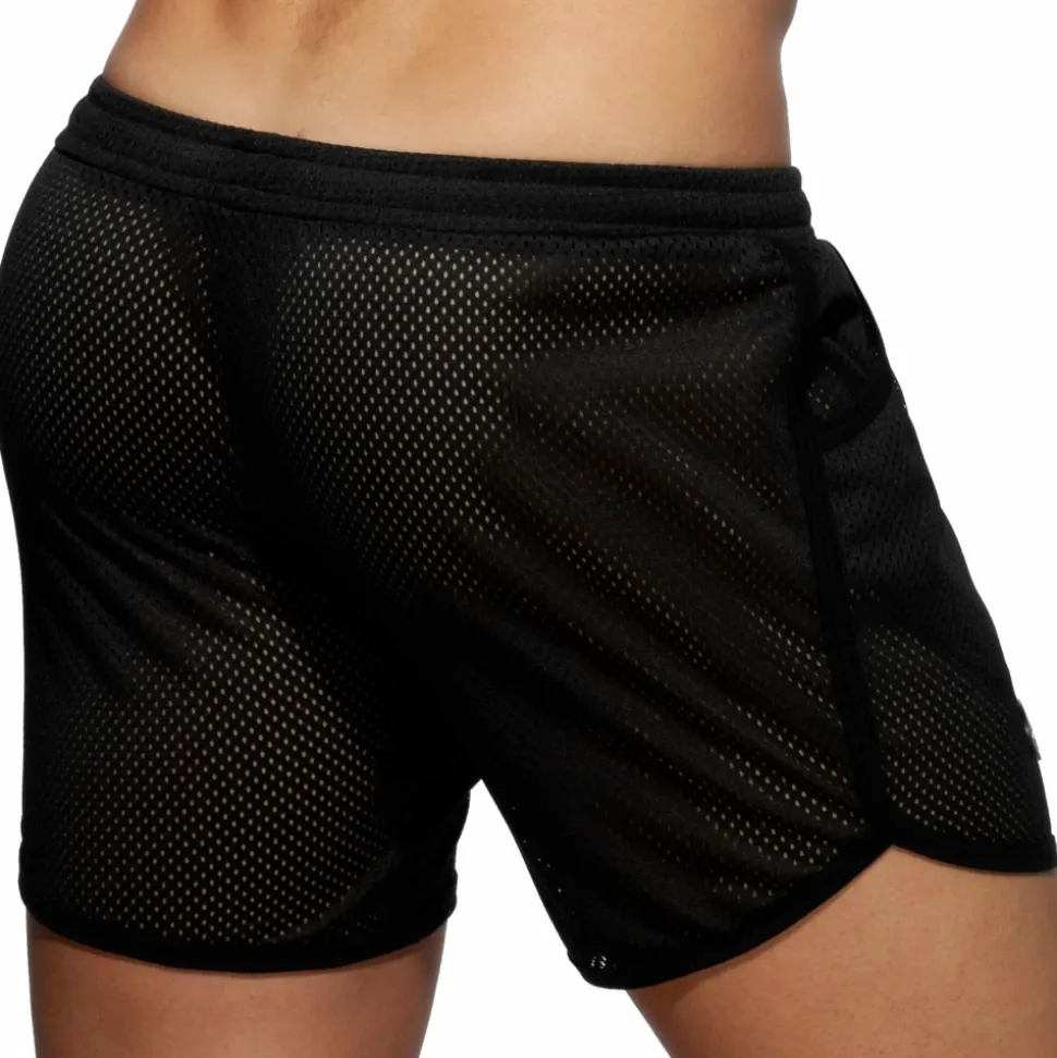 Short mi-cuisse en mesh sport non doublé pour une grande transparence. Coupe rétro et échancrée sur les côtés. 1 poche. Logo AD Fetish en silicone sur la cuisse droite. Ceinture élastique.