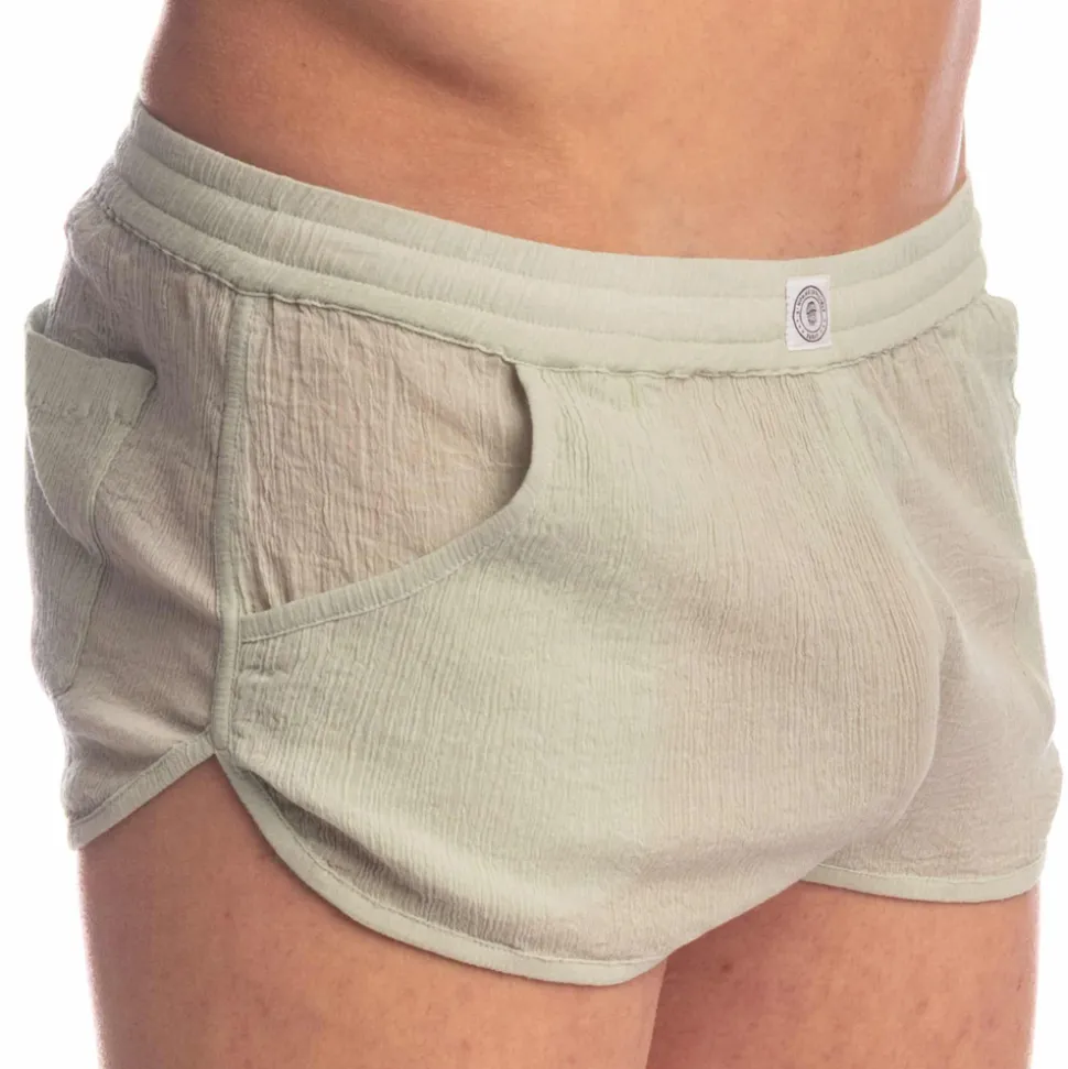 Short élégant et décontracté en crêpe de coton semi-transparent. Coupe courte et arrondie sur les côtés. 3 poches. Ceinture élastique avec cordon de serrage intérieur. Logo L’homme Invisible à la taille.