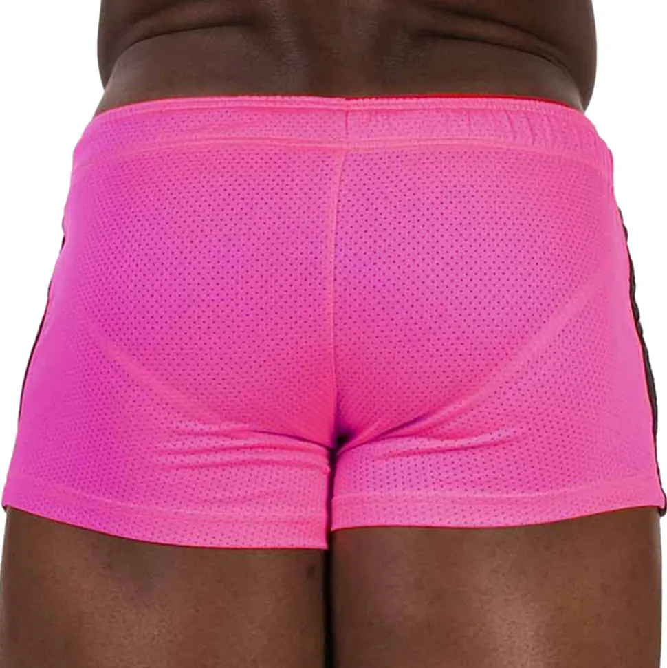 Short court et sexy en mesh respirant non doublé. Bandes sport colorées sur les côtés. Poche intérieure pour un grand confort frontal. Ceinture élastique avec cordon de serrage. Logo Barcode sur la cuisse gauche.