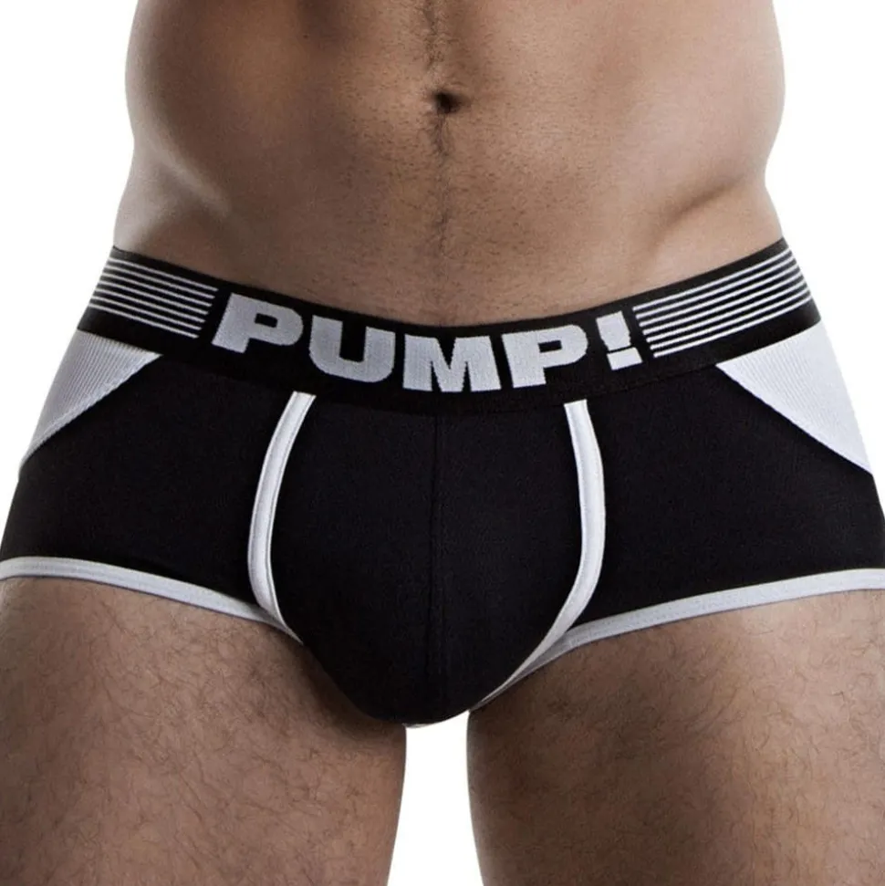 Shorty taille basse, en mesh doux, respirant et confortable. L’arrière a été découpé, à la manière d’un jockstrap, afin d’offrir une totale liberté de mouvement. Empiècements en microfibre côtelée sur les côtés et le haut des fesses. Bordures de couleur contrastée. Ceinture élastique signée PUMP!.