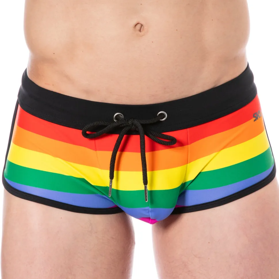 Shorty de bain en microfibre séchant rapidement. Imprimé rayé aux couleurs de l’arc-en-ciel. Coupe taille basse très ajustée. Poche frontale doublée. Bordures de couleur contrastée. Logo SKU imprimé sur la cuisse gauche. Ceinture élastique avec cordon de serrage.