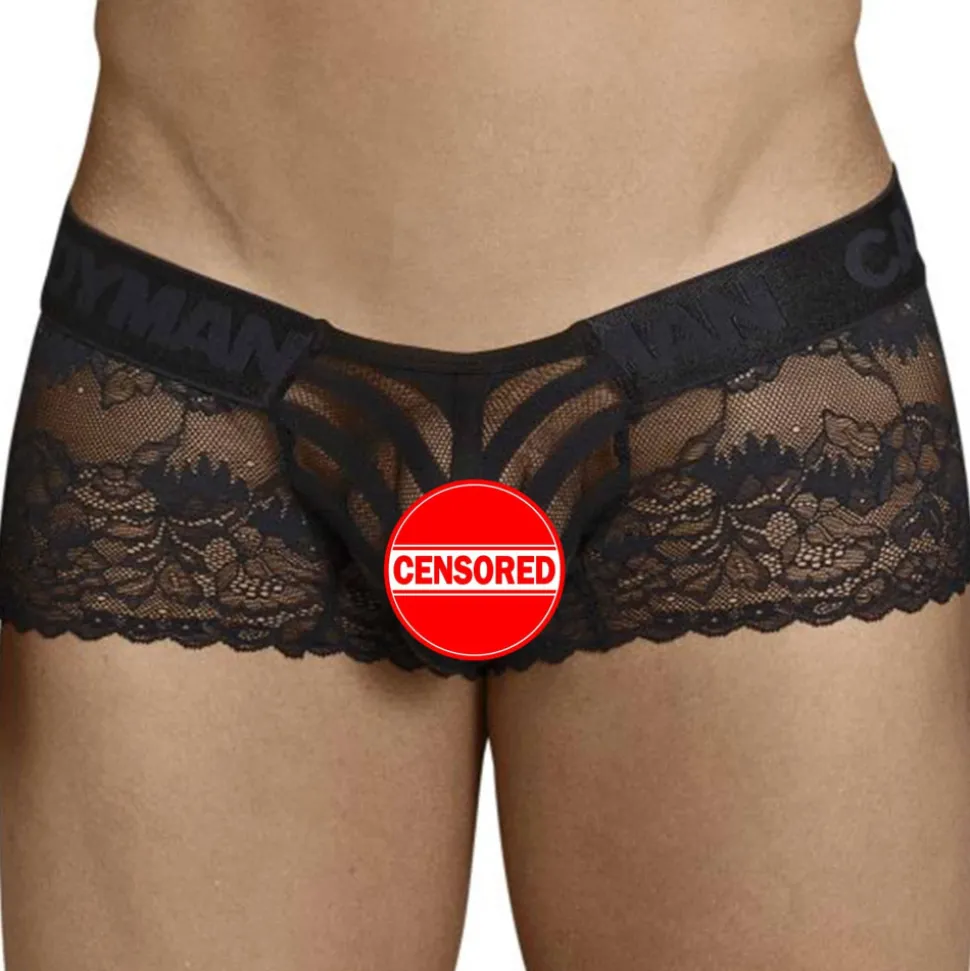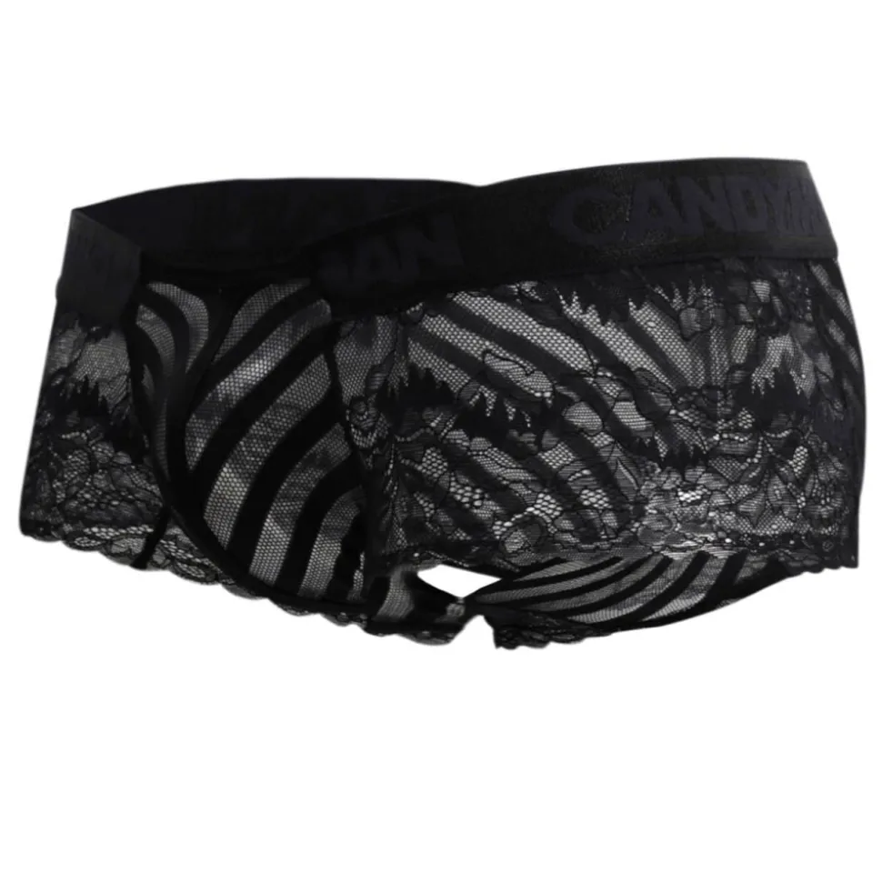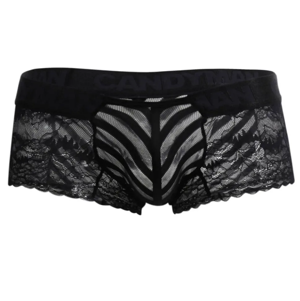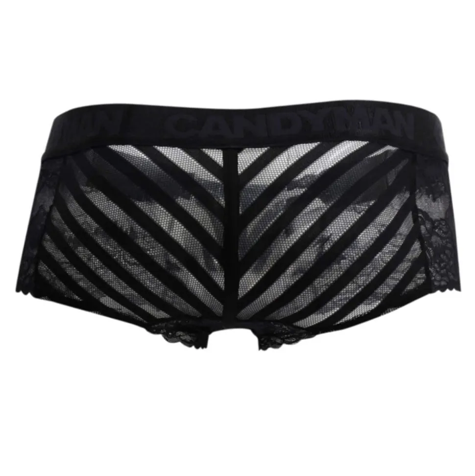 Shorty transparent en dentelle forale et résille rayée. Poche frontale non doublée. Ceinture élastique assortie.