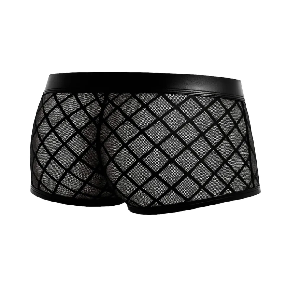 Shorty très sexy en résille extensible transparente, ornée d’un motif géométrique façon toile d’araignée. Coupe minimaliste, taille basse et très ajustée. Poche frontale préformée non doublée. Ceinture élastique en simili cuir.
