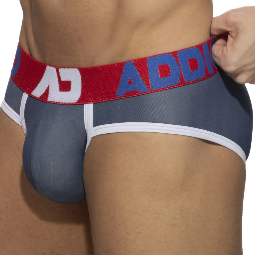 Slip taille basse très ajusté en microfibre stretch ultra douce et confortable. Matière texturée imitant le jean. Bordures de couleur contrastée. Ceinture élastique signée Addicted.