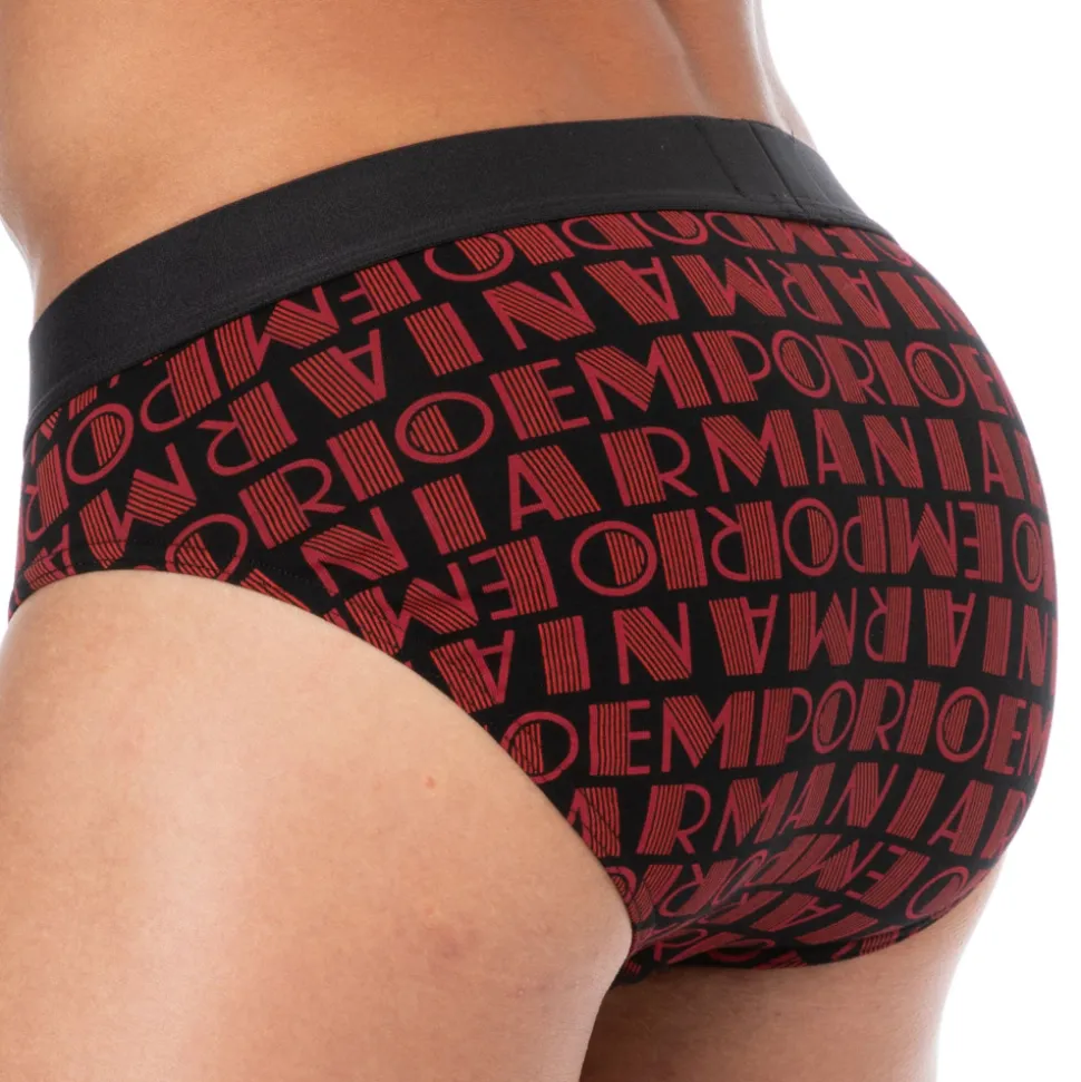 Slip doux et confortable en coton stretch imprimé de logos allover. Poche frontale doublée. Ceinture élastique signée Emporio Armani.