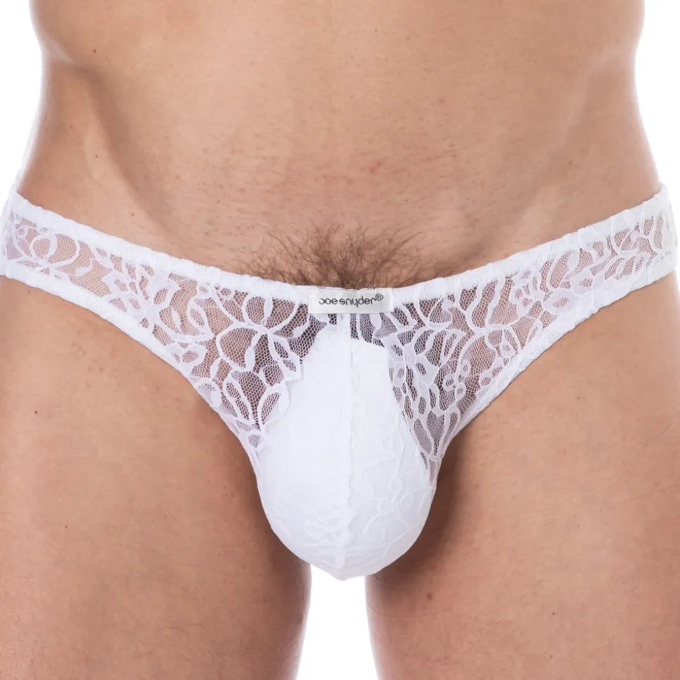 Slip minimaliste très provocant avec sa poche Bulge qui soulève et projette votre masculinité vers l’avant. Conçu en dentelle transparente. Partie arrière bien enveloppante. Etiquette Joe Snyder cousue sur la fine ceinture élastique recouverte.